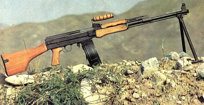 The Type 81 7.62mm squad machine gun with a 75-round drum (above) and Type 81 7.62mm assault rifle with a special 20-round magazine (below). The weapon was exported to a number of countries in South Asia and Africa through the state-run NORINCO.81式7.62毫米班机枪(下面)使用75发弹鼓(上面)和81式7.62毫米突击步枪使用一个专用20发弹匣(下面)。武器经过国营的中国北方工业总公司(NORINCO)外销到南亚和非洲许多的国家。