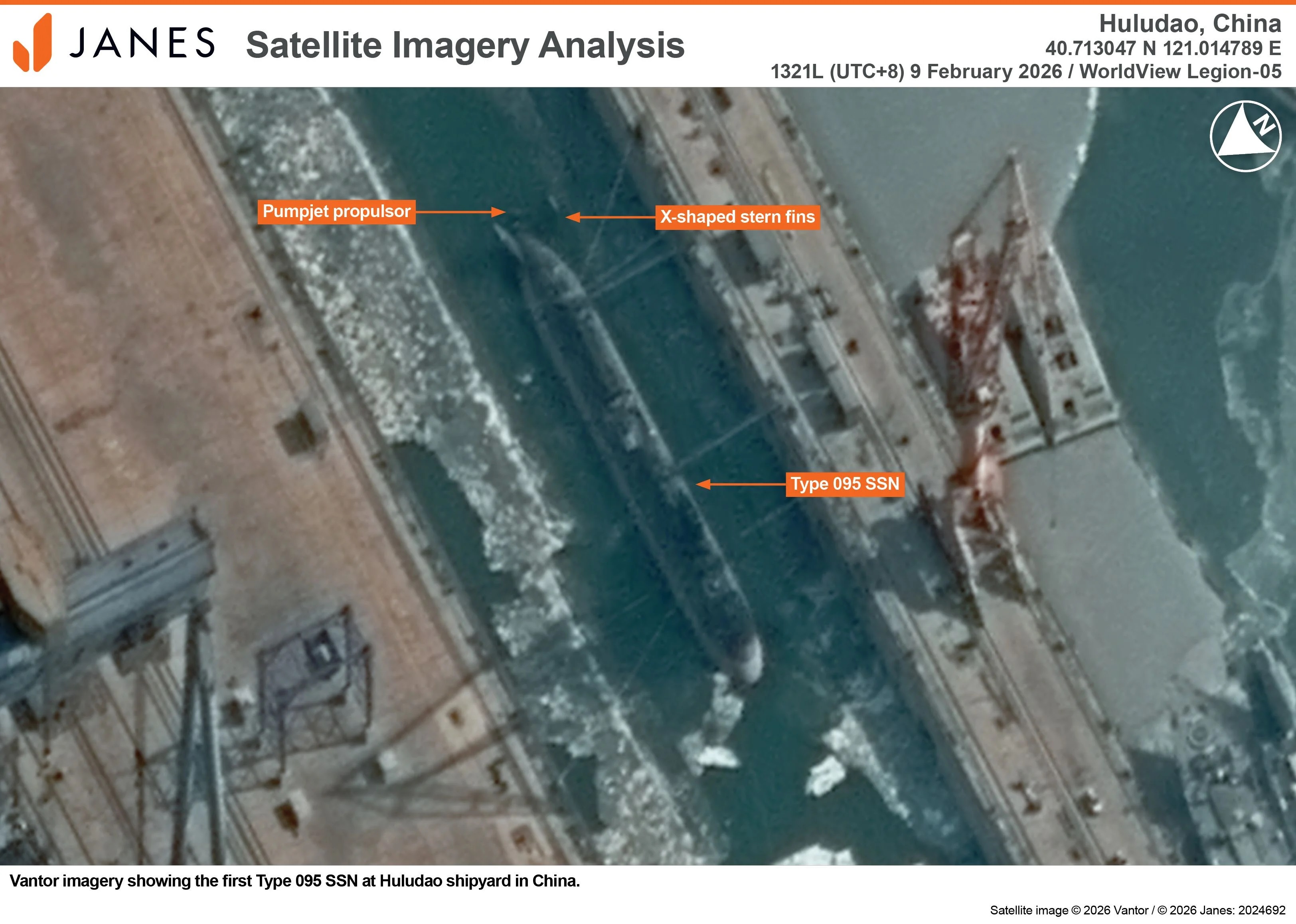 Satellite imagery captured on 9 February 2026 has revealed what appears to be the first example of China's new-generation Type 095 nuclear-powered attack submarine (SSN) undergoing fitting-out at the Huludao shipyard.